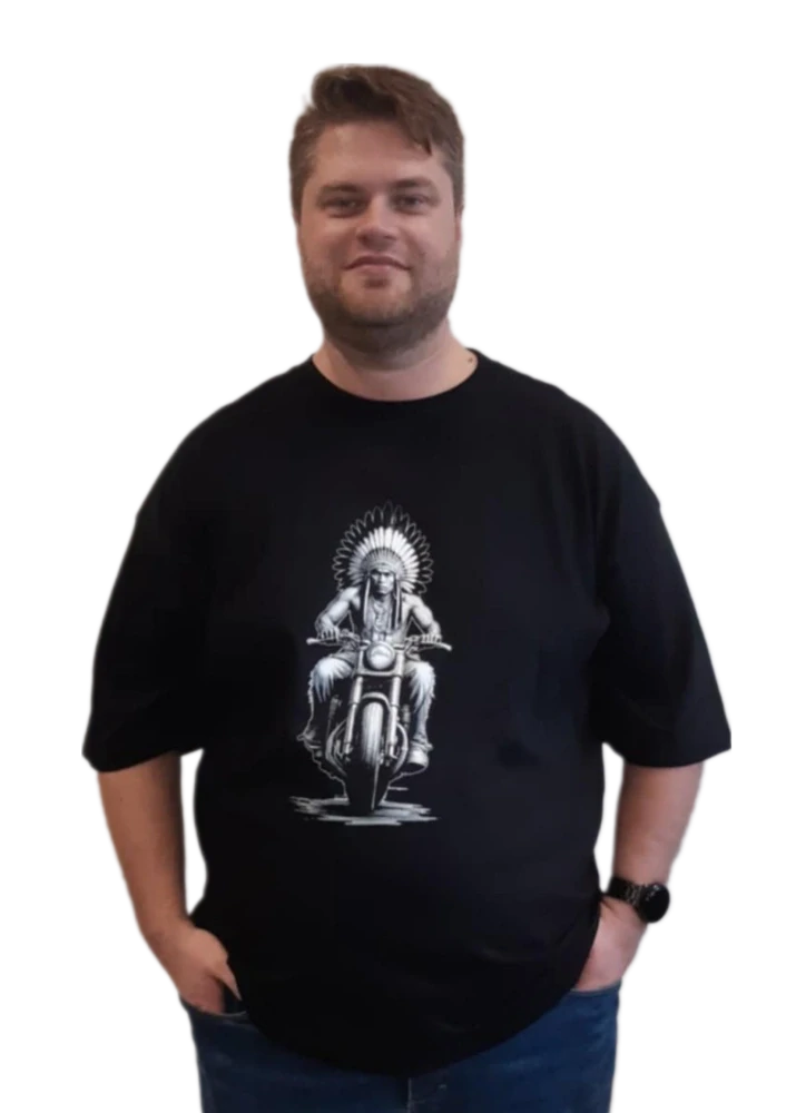 Originální pánské tričko s Indiánem na motorce od firmy Romantykxxl.cz najdete zde na eshopu od velikosti XL až do nadměrné velikosti 8XL. V tričku s Indiánem budete nepřehlédnutelný... potisk Indiána na tričku je prostě "in".